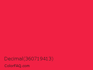Decimal 360719413 Color is a normal red color and the nearest color is Red Crayola #ee204d. Hex code #f12043 and RGB value is rgb(241,32,67). In RGB color space, this color is composed of 95% red, 13% green, 26% blue, In CMYK color space, this color is composed of 0% cyan, 87% magenta, 72% yellow , 5% black , In HSL color space, this color has a hue angle of 350° , 88% saturation and 54% lightness.