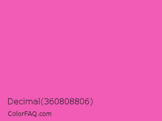 Decimal 360808806 Color is a light magenta color and the nearest color is Hot Pink #ff69b4. Hex code #f15db6 and RGB value is rgb(241,93,182). In RGB color space, this color is composed of 95% red, 36% green, 71% blue, In CMYK color space, this color is composed of 0% cyan, 61% magenta, 24% yellow , 5% black , In HSL color space, this color has a hue angle of 324° , 84% saturation and 65% lightness.