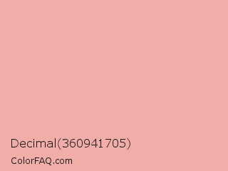 Decimal 360941705 Color is a light red color and the nearest color is Rose Bud #fbb2a3. Hex code #f1aea9 and RGB value is rgb(241,174,169). In RGB color space, this color is composed of 95% red, 68% green, 66% blue, In CMYK color space, this color is composed of 0% cyan, 28% magenta, 30% yellow , 5% black , In HSL color space, this color has a hue angle of 4° , 72% saturation and 80% lightness.