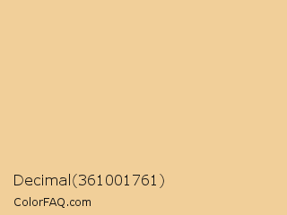 Decimal 361001761 Color is a light orange color and the nearest color is Manhattan #f5c999. Hex code #f1cf99 and RGB value is rgb(241,207,153). In RGB color space, this color is composed of 95% red, 81% green, 60% blue, In CMYK color space, this color is composed of 0% cyan, 14% magenta, 37% yellow , 5% black , In HSL color space, this color has a hue angle of 37° , 76% saturation and 77% lightness.
