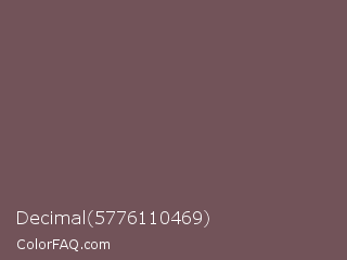 Decimal 5776110469 Color is a normal red color and the nearest color is Russett #755a57. Hex code #725359 and RGB value is rgb(114,83,89). In RGB color space, this color is composed of 45% red, 33% green, 35% blue, In CMYK color space, this color is composed of 0% cyan, 27% magenta, 22% yellow , 55% black , In HSL color space, this color has a hue angle of 348° , 16% saturation and 39% lightness.