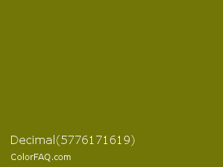 Decimal 5776171619 Color is a dark yellow color and the nearest color is Bronze Yellow #737000. Hex code #727607 and RGB value is rgb(114,118,7). In RGB color space, this color is composed of 45% red, 46% green, 3% blue, In CMYK color space, this color is composed of 3% cyan, 0% magenta, 94% yellow , 54% black , In HSL color space, this color has a hue angle of 62° , 89% saturation and 25% lightness.