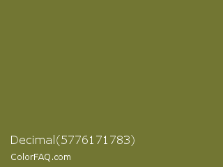 Decimal 5776171783 Color is a normal yellow color and the nearest color is Pesto #7c7631. Hex code #727633 and RGB value is rgb(114,118,51). In RGB color space, this color is composed of 45% red, 46% green, 20% blue, In CMYK color space, this color is composed of 3% cyan, 0% magenta, 57% yellow , 54% black , In HSL color space, this color has a hue angle of 64° , 40% saturation and 33% lightness.
