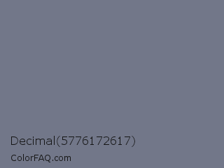 Decimal 5776172617 Color is a normal blue color and the nearest color is Raven #727b89. Hex code #727789 and RGB value is rgb(114,119,137). In RGB color space, this color is composed of 45% red, 47% green, 54% blue, In CMYK color space, this color is composed of 17% cyan, 13% magenta, 0% yellow , 46% black , In HSL color space, this color has a hue angle of 227° , 9% saturation and 49% lightness.