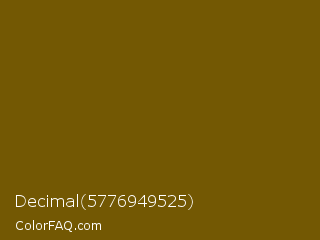 Decimal 5776949525 Color is a dark yellow color and the nearest color is Antique Bronze #704a07. Hex code #735803 and RGB value is rgb(115,88,3). In RGB color space, this color is composed of 45% red, 35% green, 1% blue, In CMYK color space, this color is composed of 0% cyan, 23% magenta, 97% yellow , 55% black , In HSL color space, this color has a hue angle of 46° , 95% saturation and 23% lightness.