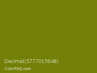 Decimal 5777015648 Color is a dark yellow color and the nearest color is Olive #808000. Hex code #738008 and RGB value is rgb(115,128,8). In RGB color space, this color is composed of 45% red, 50% green, 3% blue, In CMYK color space, this color is composed of 10% cyan, 0% magenta, 94% yellow , 50% black , In HSL color space, this color has a hue angle of 67° , 88% saturation and 27% lightness.