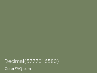 Decimal 5777016580 Color is a normal green color and the nearest color is Limed Ash #747d63. Hex code #738160 and RGB value is rgb(115,129,96). In RGB color space, this color is composed of 45% red, 51% green, 38% blue, In CMYK color space, this color is composed of 11% cyan, 0% magenta, 26% yellow , 49% black , In HSL color space, this color has a hue angle of 85° , 15% saturation and 44% lightness.