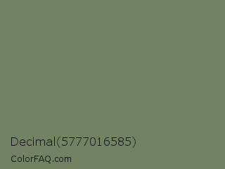 Decimal 5777016585 Color is a normal green color and the nearest color is Limed Ash #747d63. Hex code #738165 and RGB value is rgb(115,129,101). In RGB color space, this color is composed of 45% red, 51% green, 40% blue, In CMYK color space, this color is composed of 11% cyan, 0% magenta, 22% yellow , 49% black , In HSL color space, this color has a hue angle of 90° , 12% saturation and 45% lightness.