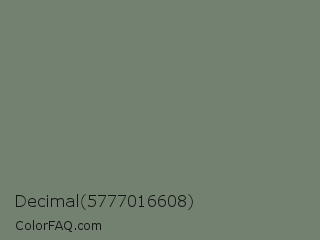 Decimal 5777016608 Color is a normal green color and the nearest color is Smoke #738276. Hex code #738170 and RGB value is rgb(115,129,112). In RGB color space, this color is composed of 45% red, 51% green, 44% blue, In CMYK color space, this color is composed of 11% cyan, 0% magenta, 13% yellow , 49% black , In HSL color space, this color has a hue angle of 109° , 7% saturation and 47% lightness.