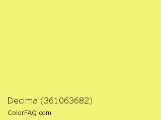 Decimal 361063682 Color is a light yellow color and the nearest color is Sunny #f2f27a. Hex code #f1f376 and RGB value is rgb(241,243,118). In RGB color space, this color is composed of 95% red, 95% green, 46% blue, In CMYK color space, this color is composed of 1% cyan, 0% magenta, 51% yellow , 5% black , In HSL color space, this color has a hue angle of 61° , 84% saturation and 71% lightness.