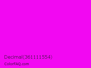 Decimal 361111554 Color is a normal magenta color and the nearest color is Magenta / Fuchsia #ff00ff. Hex code #f208f2 and RGB value is rgb(242,8,242). In RGB color space, this color is composed of 95% red, 3% green, 95% blue, In CMYK color space, this color is composed of 0% cyan, 97% magenta, 0% yellow , 5% black , In HSL color space, this color has a hue angle of 300° , 94% saturation and 49% lightness.
