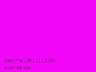 Decimal 361111559 Color is a normal magenta color and the nearest color is Magenta / Fuchsia #ff00ff. Hex code #f208f7 and RGB value is rgb(242,8,247). In RGB color space, this color is composed of 95% red, 3% green, 97% blue, In CMYK color space, this color is composed of 2% cyan, 97% magenta, 0% yellow , 3% black , In HSL color space, this color has a hue angle of 299° , 94% saturation and 50% lightness.