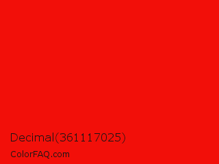 Decimal 361117025 Color is a normal red color and the nearest color is Candy Apple Red #ff0800. Hex code #f20f09 and RGB value is rgb(242,15,9). In RGB color space, this color is composed of 95% red, 6% green, 4% blue, In CMYK color space, this color is composed of 0% cyan, 94% magenta, 96% yellow , 5% black , In HSL color space, this color has a hue angle of 2° , 93% saturation and 49% lightness.