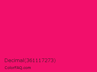 Decimal 361117273 Color is a normal rose color and the nearest color is Vivid Raspberry #ff006c. Hex code #f20f6b and RGB value is rgb(242,15,107). In RGB color space, this color is composed of 95% red, 6% green, 42% blue, In CMYK color space, this color is composed of 0% cyan, 94% magenta, 56% yellow , 5% black , In HSL color space, this color has a hue angle of 336° , 90% saturation and 50% lightness.