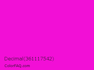 Decimal 361117542 Color is a normal magenta color and the nearest color is Hot Magenta #ff1dce. Hex code #f20fd6 and RGB value is rgb(242,15,214). In RGB color space, this color is composed of 95% red, 6% green, 84% blue, In CMYK color space, this color is composed of 0% cyan, 94% magenta, 12% yellow , 5% black , In HSL color space, this color has a hue angle of 307° , 90% saturation and 50% lightness.