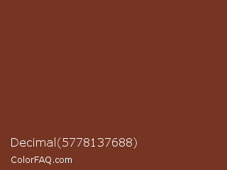 Decimal 5778137688 Color is a dark red color and the nearest color is Red Robin #80341f. Hex code #753522 and RGB value is rgb(117,53,34). In RGB color space, this color is composed of 46% red, 21% green, 13% blue, In CMYK color space, this color is composed of 0% cyan, 55% magenta, 71% yellow , 54% black , In HSL color space, this color has a hue angle of 14° , 55% saturation and 30% lightness.