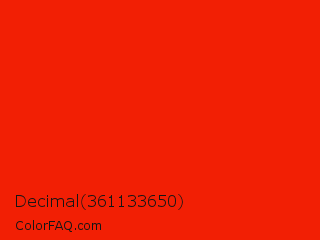 Decimal 361133650 Color is a normal red color and the nearest color is Scarlet #ff2400. Hex code #f21f04 and RGB value is rgb(242,31,4). In RGB color space, this color is composed of 95% red, 12% green, 2% blue, In CMYK color space, this color is composed of 0% cyan, 87% magenta, 98% yellow , 5% black , In HSL color space, this color has a hue angle of 7° , 97% saturation and 48% lightness.