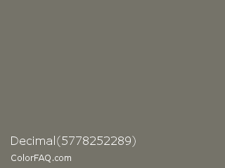 Decimal 5778252289 Color is a normal yellow color and the nearest color is Pablo #776f61. Hex code #757369 and RGB value is rgb(117,115,105). In RGB color space, this color is composed of 46% red, 45% green, 41% blue, In CMYK color space, this color is composed of 0% cyan, 2% magenta, 10% yellow , 54% black , In HSL color space, this color has a hue angle of 50° , 5% saturation and 44% lightness.