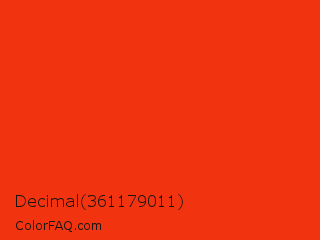 Decimal 361179011 Color is a normal red color and the nearest color is Red RYB #fe2712. Hex code #f2330f and RGB value is rgb(242,51,15). In RGB color space, this color is composed of 95% red, 20% green, 6% blue, In CMYK color space, this color is composed of 0% cyan, 79% magenta, 94% yellow , 5% black , In HSL color space, this color has a hue angle of 10° , 90% saturation and 50% lightness.