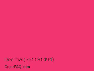 Decimal 361181494 Color is a normal rose color and the nearest color is Paradise Pink #e63e62. Hex code #f23470 and RGB value is rgb(242,52,112). In RGB color space, this color is composed of 95% red, 20% green, 44% blue, In CMYK color space, this color is composed of 0% cyan, 79% magenta, 54% yellow , 5% black , In HSL color space, this color has a hue angle of 341° , 88% saturation and 58% lightness.