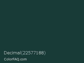 Decimal 22577188 Color is a very dark cyan color and the nearest color is Gable Green #163531. Hex code #183b38 and RGB value is rgb(24,59,56). In RGB color space, this color is composed of 9% red, 23% green, 22% blue, In CMYK color space, this color is composed of 59% cyan, 0% magenta, 5% yellow , 77% black , In HSL color space, this color has a hue angle of 175° , 42% saturation and 16% lightness.