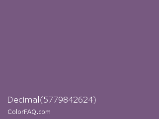 Decimal 5779842624 Color is a normal purple color and the nearest color is Old Lavender #796878. Hex code #775980 and RGB value is rgb(119,89,128). In RGB color space, this color is composed of 47% red, 35% green, 50% blue, In CMYK color space, this color is composed of 7% cyan, 30% magenta, 0% yellow , 50% black , In HSL color space, this color has a hue angle of 286° , 18% saturation and 43% lightness.