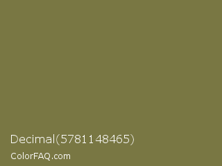 Decimal 5781148465 Color is a normal yellow color and the nearest color is Gold Fusion #85754e. Hex code #797743 and RGB value is rgb(121,119,67). In RGB color space, this color is composed of 47% red, 47% green, 26% blue, In CMYK color space, this color is composed of 0% cyan, 2% magenta, 45% yellow , 53% black , In HSL color space, this color has a hue angle of 58° , 29% saturation and 37% lightness.