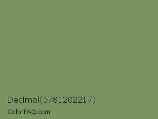 Decimal 5781202217 Color is a normal green color and the nearest color is Highland #6f8e63. Hex code #799361 and RGB value is rgb(121,147,97). In RGB color space, this color is composed of 47% red, 58% green, 38% blue, In CMYK color space, this color is composed of 18% cyan, 0% magenta, 34% yellow , 42% black , In HSL color space, this color has a hue angle of 91° , 20% saturation and 48% lightness.