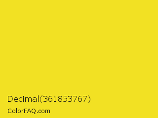 Decimal 361853767 Color is a normal yellow color and the nearest color is Ripe Lemon #f4d81c. Hex code #f2e123 and RGB value is rgb(242,225,35). In RGB color space, this color is composed of 95% red, 88% green, 14% blue, In CMYK color space, this color is composed of 0% cyan, 7% magenta, 86% yellow , 5% black , In HSL color space, this color has a hue angle of 55° , 89% saturation and 54% lightness.