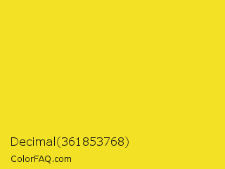 Decimal 361853768 Color is a normal yellow color and the nearest color is Dandelion #f0e130. Hex code #f2e124 and RGB value is rgb(242,225,36). In RGB color space, this color is composed of 95% red, 88% green, 14% blue, In CMYK color space, this color is composed of 0% cyan, 7% magenta, 85% yellow , 5% black , In HSL color space, this color has a hue angle of 55° , 89% saturation and 55% lightness.