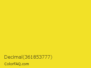 Decimal 361853777 Color is a normal yellow color and the nearest color is Dandelion #f0e130. Hex code #f2e127 and RGB value is rgb(242,225,39). In RGB color space, this color is composed of 95% red, 88% green, 15% blue, In CMYK color space, this color is composed of 0% cyan, 7% magenta, 84% yellow , 5% black , In HSL color space, this color has a hue angle of 55° , 89% saturation and 55% lightness.