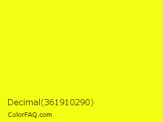 Decimal 361910290 Color is a normal yellow color and the nearest color is Lemon Glacier #fdff00. Hex code #f2ff14 and RGB value is rgb(242,255,20). In RGB color space, this color is composed of 95% red, 100% green, 8% blue, In CMYK color space, this color is composed of 5% cyan, 0% magenta, 92% yellow , 0% black , In HSL color space, this color has a hue angle of 63° , 100% saturation and 54% lightness.