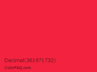 Decimal 361971732 Color is a normal red color and the nearest color is Imperial Red #ed2939. Hex code #f3223e and RGB value is rgb(243,34,62). In RGB color space, this color is composed of 95% red, 13% green, 24% blue, In CMYK color space, this color is composed of 0% cyan, 86% magenta, 74% yellow , 5% black , In HSL color space, this color has a hue angle of 352° , 90% saturation and 54% lightness.