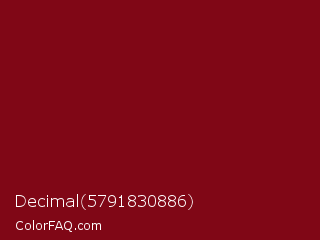 Decimal 5791830886 Color is a dark red color and the nearest color is Red Devil #860111. Hex code #800716 and RGB value is rgb(128,7,22). In RGB color space, this color is composed of 50% red, 3% green, 9% blue, In CMYK color space, this color is composed of 0% cyan, 95% magenta, 83% yellow , 50% black , In HSL color space, this color has a hue angle of 353° , 90% saturation and 26% lightness.