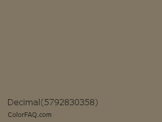 Decimal 5792830358 Color is a normal orange color and the nearest color is Sand Dune #826f65. Hex code #817664 and RGB value is rgb(129,118,100). In RGB color space, this color is composed of 51% red, 46% green, 39% blue, In CMYK color space, this color is composed of 0% cyan, 9% magenta, 22% yellow , 49% black , In HSL color space, this color has a hue angle of 37° , 13% saturation and 45% lightness.