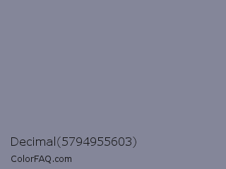 Decimal 5794955603 Color is a normal blue color and the nearest color is Roman Silver #838996. Hex code #848699 and RGB value is rgb(132,134,153). In RGB color space, this color is composed of 52% red, 53% green, 60% blue, In CMYK color space, this color is composed of 14% cyan, 12% magenta, 0% yellow , 40% black , In HSL color space, this color has a hue angle of 234° , 9% saturation and 56% lightness.