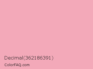 Decimal 362186391 Color is a very light red color and the nearest color is Amaranth Pink #f19cbb. Hex code #f3a9b9 and RGB value is rgb(243,169,185). In RGB color space, this color is composed of 95% red, 66% green, 73% blue, In CMYK color space, this color is composed of 0% cyan, 30% magenta, 24% yellow , 5% black , In HSL color space, this color has a hue angle of 347° , 76% saturation and 81% lightness.