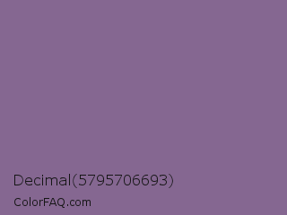 Decimal 5795706693 Color is a normal purple color and the nearest color is French Lilac #86608e. Hex code #856791 and RGB value is rgb(133,103,145). In RGB color space, this color is composed of 52% red, 40% green, 57% blue, In CMYK color space, this color is composed of 8% cyan, 29% magenta, 0% yellow , 43% black , In HSL color space, this color has a hue angle of 283° , 17% saturation and 49% lightness.