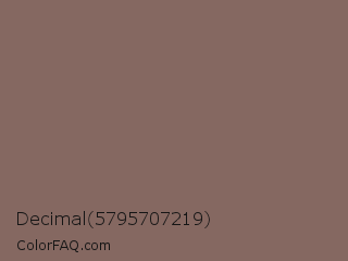 Decimal 5795707219 Color is a normal red color and the nearest color is Sand Dune #826f65. Hex code #856861 and RGB value is rgb(133,104,97). In RGB color space, this color is composed of 52% red, 41% green, 38% blue, In CMYK color space, this color is composed of 0% cyan, 22% magenta, 27% yellow , 48% black , In HSL color space, this color has a hue angle of 12° , 16% saturation and 45% lightness.