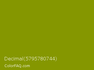 Decimal 5795780744 Color is a dark yellow color and the nearest color is Limeade #6f9d02. Hex code #859700 and RGB value is rgb(133,151,0). In RGB color space, this color is composed of 52% red, 59% green, 0% blue, In CMYK color space, this color is composed of 12% cyan, 0% magenta, 100% yellow , 41% black , In HSL color space, this color has a hue angle of 67° , 100% saturation and 30% lightness.