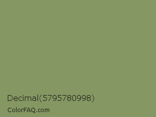 Decimal 5795780998 Color is a normal green color and the nearest color is Moss Green #8a9a5b. Hex code #859762 and RGB value is rgb(133,151,98). In RGB color space, this color is composed of 52% red, 59% green, 38% blue, In CMYK color space, this color is composed of 12% cyan, 0% magenta, 35% yellow , 41% black , In HSL color space, this color has a hue angle of 80° , 21% saturation and 49% lightness.