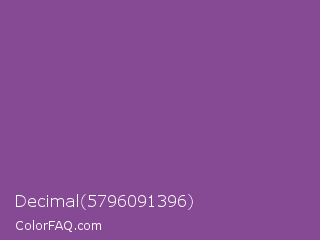 Decimal 5796091396 Color is a normal purple color and the nearest color is Razzmic Berry #8d4e85. Hex code #864994 and RGB value is rgb(134,73,148). In RGB color space, this color is composed of 53% red, 29% green, 58% blue, In CMYK color space, this color is composed of 9% cyan, 51% magenta, 0% yellow , 42% black , In HSL color space, this color has a hue angle of 289° , 34% saturation and 43% lightness.