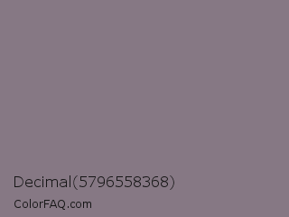 Decimal 5796558368 Color is a normal magenta color and the nearest color is Rocket Metallic #8a7f80. Hex code #867884 and RGB value is rgb(134,120,132). In RGB color space, this color is composed of 53% red, 47% green, 52% blue, In CMYK color space, this color is composed of 0% cyan, 10% magenta, 1% yellow , 47% black , In HSL color space, this color has a hue angle of 309° , 6% saturation and 50% lightness.
