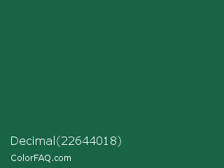 Decimal 22644018 Color is a dark green color and the nearest color is Green Pea #1d6142. Hex code #186444 and RGB value is rgb(24,100,68). In RGB color space, this color is composed of 9% red, 39% green, 27% blue, In CMYK color space, this color is composed of 76% cyan, 0% magenta, 32% yellow , 61% black , In HSL color space, this color has a hue angle of 155° , 61% saturation and 24% lightness.
