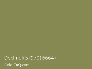 Decimal 5797016664 Color is a normal yellow color and the nearest color is Dark Tan #918151. Hex code #878952 and RGB value is rgb(135,137,82). In RGB color space, this color is composed of 53% red, 54% green, 32% blue, In CMYK color space, this color is composed of 1% cyan, 0% magenta, 40% yellow , 46% black , In HSL color space, this color has a hue angle of 62° , 25% saturation and 43% lightness.
