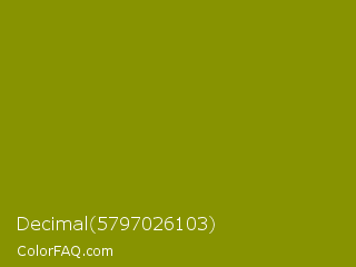 Decimal 5797026103 Color is a dark yellow color and the nearest color is Olive #808000. Hex code #879301 and RGB value is rgb(135,147,1). In RGB color space, this color is composed of 53% red, 58% green, 0% blue, In CMYK color space, this color is composed of 8% cyan, 0% magenta, 99% yellow , 42% black , In HSL color space, this color has a hue angle of 65° , 99% saturation and 29% lightness.