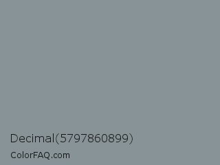 Decimal 5797860899 Color is a normal blue color and the nearest color is Regent Gray #86949f. Hex code #889397 and RGB value is rgb(136,147,151). In RGB color space, this color is composed of 53% red, 58% green, 59% blue, In CMYK color space, this color is composed of 10% cyan, 3% magenta, 0% yellow , 41% black , In HSL color space, this color has a hue angle of 196° , 7% saturation and 56% lightness.