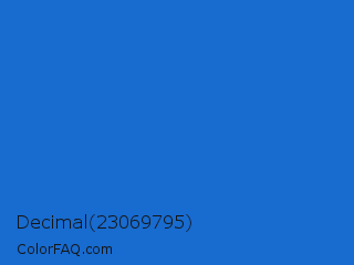 Decimal 23069795 Color is a normal blue color and the nearest color is Bright Navy Blue #1974d2. Hex code #186bcf and RGB value is rgb(24,107,207). In RGB color space, this color is composed of 9% red, 42% green, 81% blue, In CMYK color space, this color is composed of 88% cyan, 48% magenta, 0% yellow , 19% black , In HSL color space, this color has a hue angle of 213° , 79% saturation and 45% lightness.