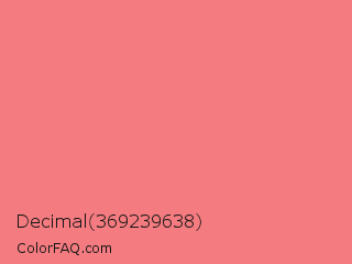 Decimal 369239638 Color is a light red color and the nearest color is Light Coral #f08080. Hex code #f47c80 and RGB value is rgb(244,124,128). In RGB color space, this color is composed of 96% red, 49% green, 50% blue, In CMYK color space, this color is composed of 0% cyan, 49% magenta, 48% yellow , 4% black , In HSL color space, this color has a hue angle of 358° , 85% saturation and 72% lightness.