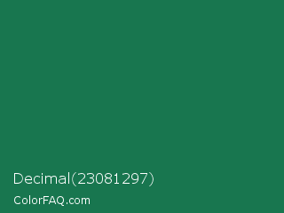 Decimal 23081297 Color is a dark green color and the nearest color is Dark Spring Green #177245. Hex code #18764f and RGB value is rgb(24,118,79). In RGB color space, this color is composed of 9% red, 46% green, 31% blue, In CMYK color space, this color is composed of 80% cyan, 0% magenta, 33% yellow , 54% black , In HSL color space, this color has a hue angle of 155° , 66% saturation and 28% lightness.